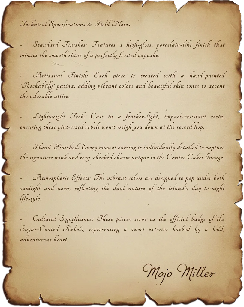Break through the strawberry-cream mists and discover the sweet, high-octane treasures of Cewtee Cakes Island. The Cewtee Cakes line features an iconic group of the Sugar-Coated Rebels, serving as a vibrant bridge between candy-colored paradise and the roar of a vintage engine. This is a nod to the vintage Kewpie Dolls that everyone knows and loves. Each piece is handcrafted to capture the glossy charm of mid-century aesthetics, reimagined through a unique rockabilly lens that balances a wink of sweetness with a leather-jacket edge. Whether you are looking for a petite powerhouse or a bold token of the island’s spirit, these hand-painted icons are ready to accompany you on your next adventure.