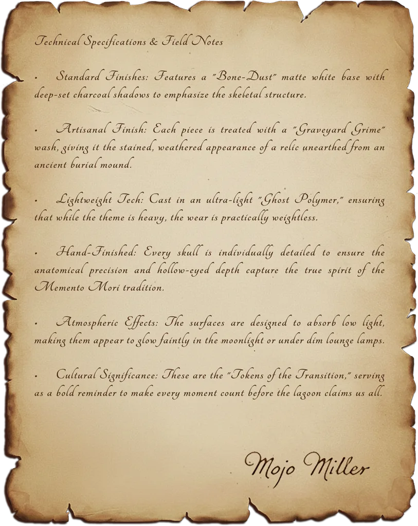 Welcome to the darker side of the lagoon, where Shadow & Stone meet timeless artistry. The Memento Mori line is crafted for those who find beauty in the mysterious and the eternal. Inspired by gothic flair and ancient whispers, these hand-painted treasures serve as a bold reminder to live life to the fullest while honoring the past. From intricate skeletal motifs to weathered relics of the afterlife, each piece in this collection is designed to bring a touch of the macabre to your unique aesthetic.