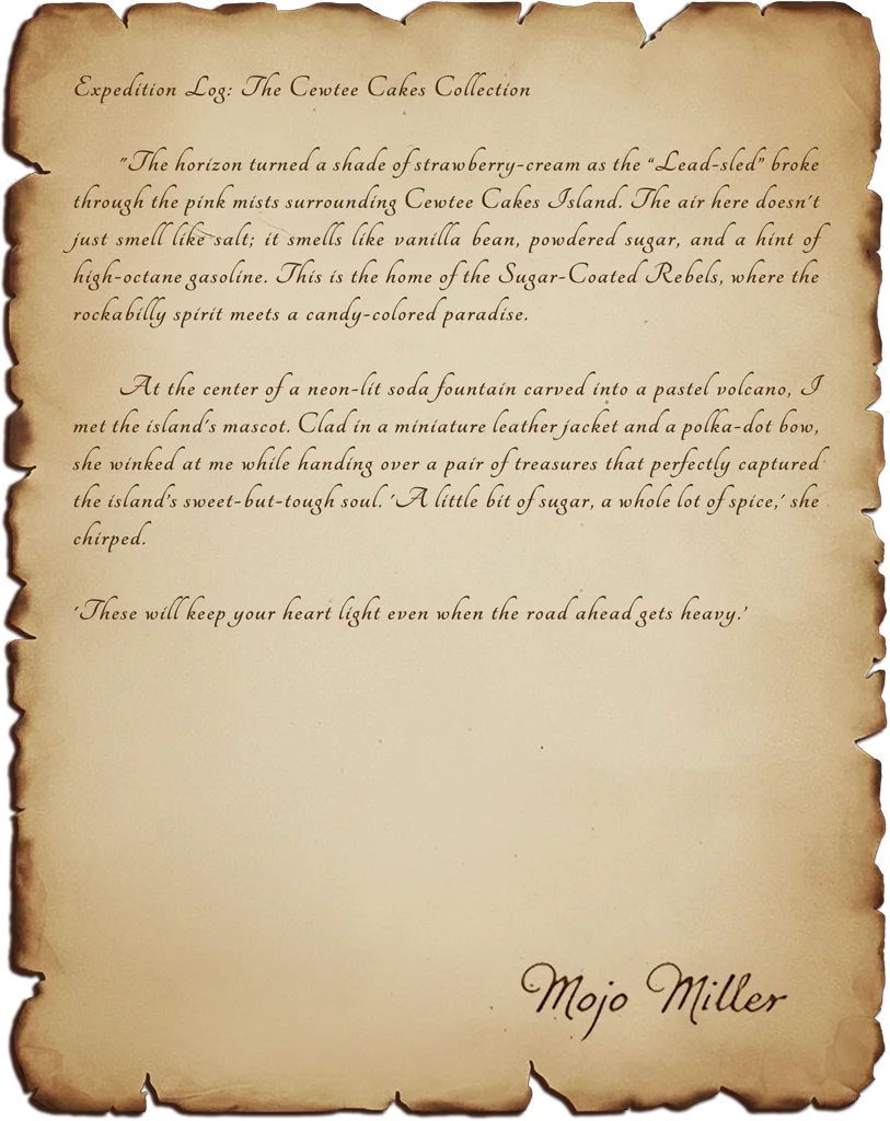 Break through the strawberry-cream mists and discover the sweet, high-octane treasures of Cewtee Cakes Island. The Cewtee Cakes line features an iconic group of the Sugar-Coated Rebels, serving as a vibrant bridge between candy-colored paradise and the roar of a vintage engine. This is a nod to the vintage Kewpie Dolls that everyone knows and loves. Each piece is handcrafted to capture the glossy charm of mid-century aesthetics, reimagined through a unique rockabilly lens that balances a wink of sweetness with a leather-jacket edge. Whether you are looking for a petite powerhouse or a bold token of the island’s spirit, these hand-painted icons are ready to accompany you on your next adventure.