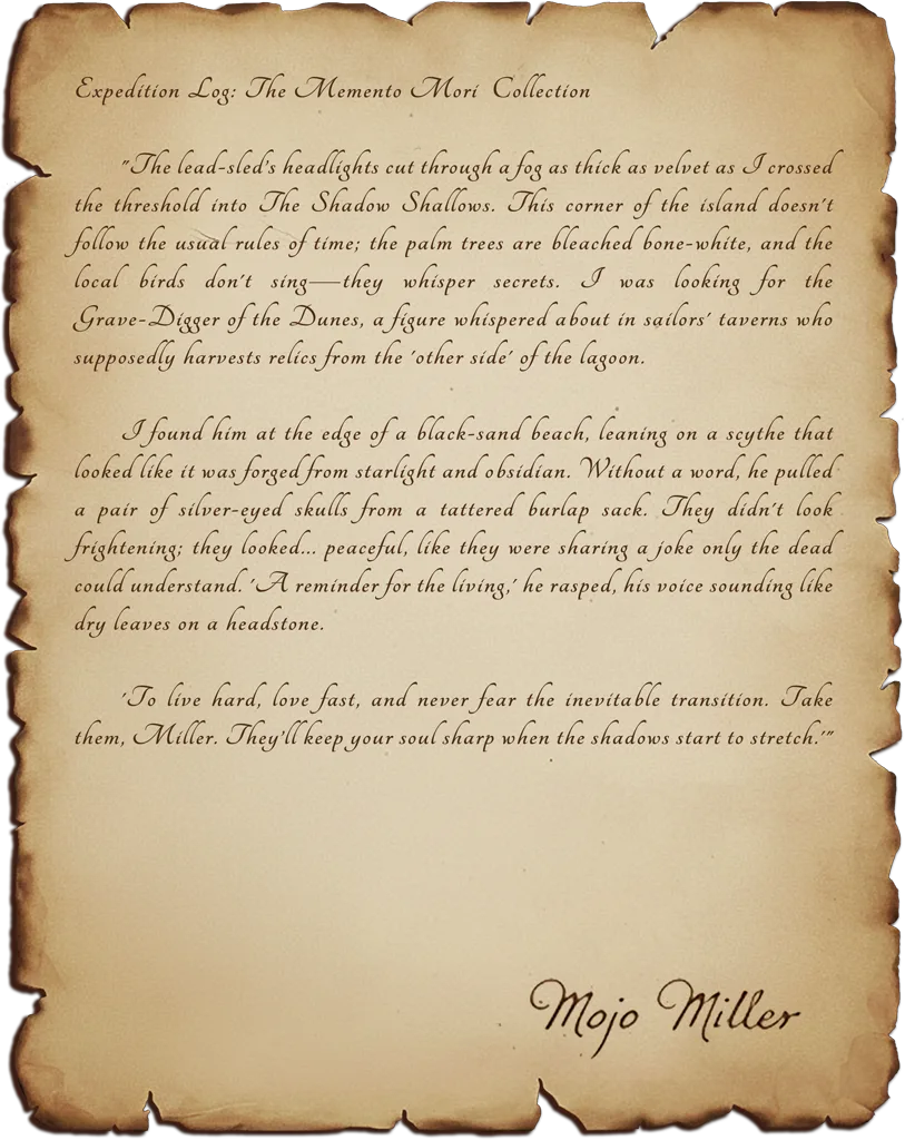 Expedition Log: Item #MME-003 | Little Lost Soul We found the inspiration for these while navigating the Crumbling Cloisters near the island's center. Tucked away in a corner of the courtyard, beneath the heavy shade of a monstera leaf, sat a small, reclining figure carved from stone. It was a "Little Lost Soul"—an angel that seemed to have fallen asleep while waiting for the world to move on. The way the tropical vines had begun to curl around the base of the monument was so poignant I knew it had to be the centerpiece of the Memento Mori collection. -Mojo Miller